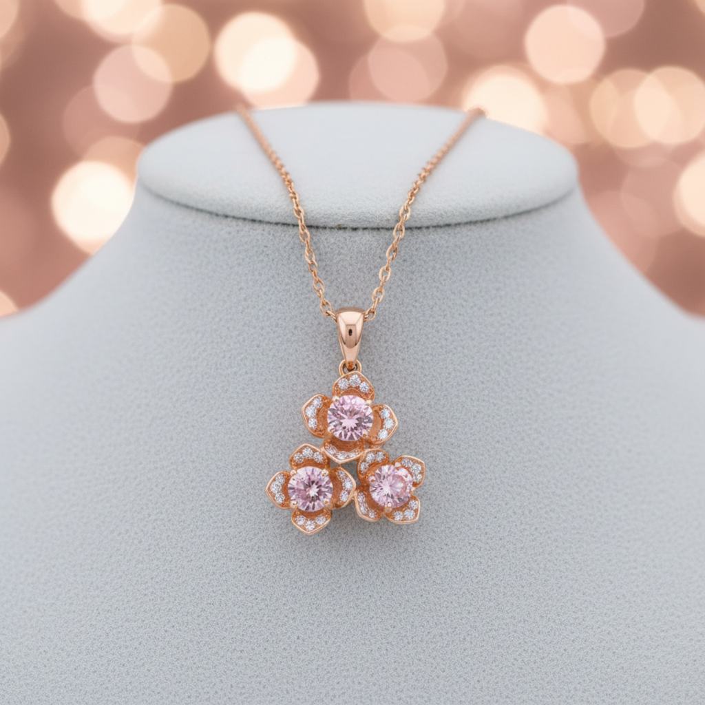 Embrace elegance and charm with the Blush Blossom Rose Gold Pendant Necklace, a delicate piece that adds a soft romantic glow to any look. Featuring three flower-shaped pendants adorned with sparkling pink crystals and surrounded by shimmering cubic zirconia accents, this necklace captures the essence of beauty and grace.